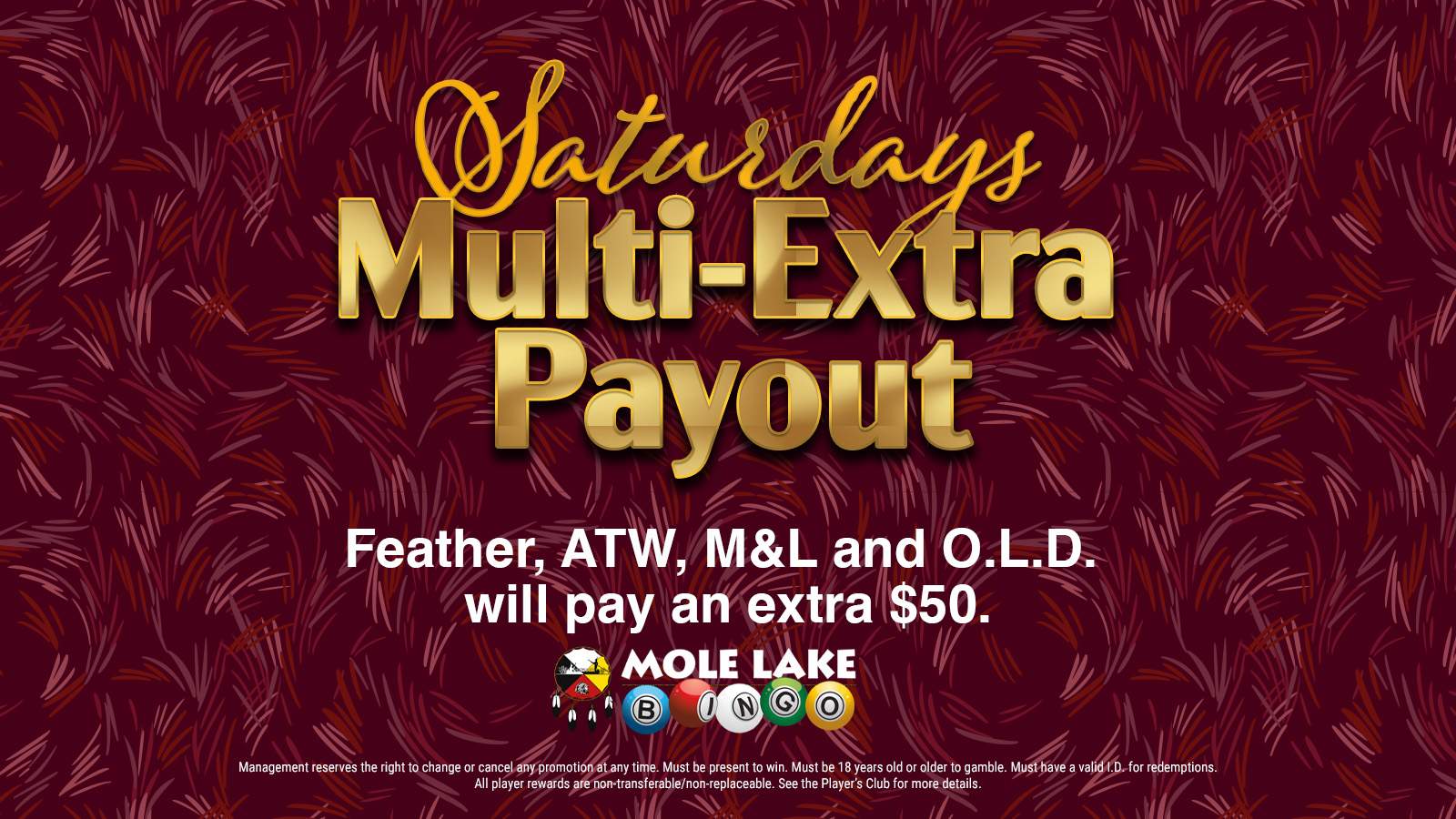 Bring your family and friends for Bingo FUN Saturdays at Mole Lake Casino, Lodge & Event Center, where Feather, ATW, M&L, and OLD games will pay AN EXTRA $50!