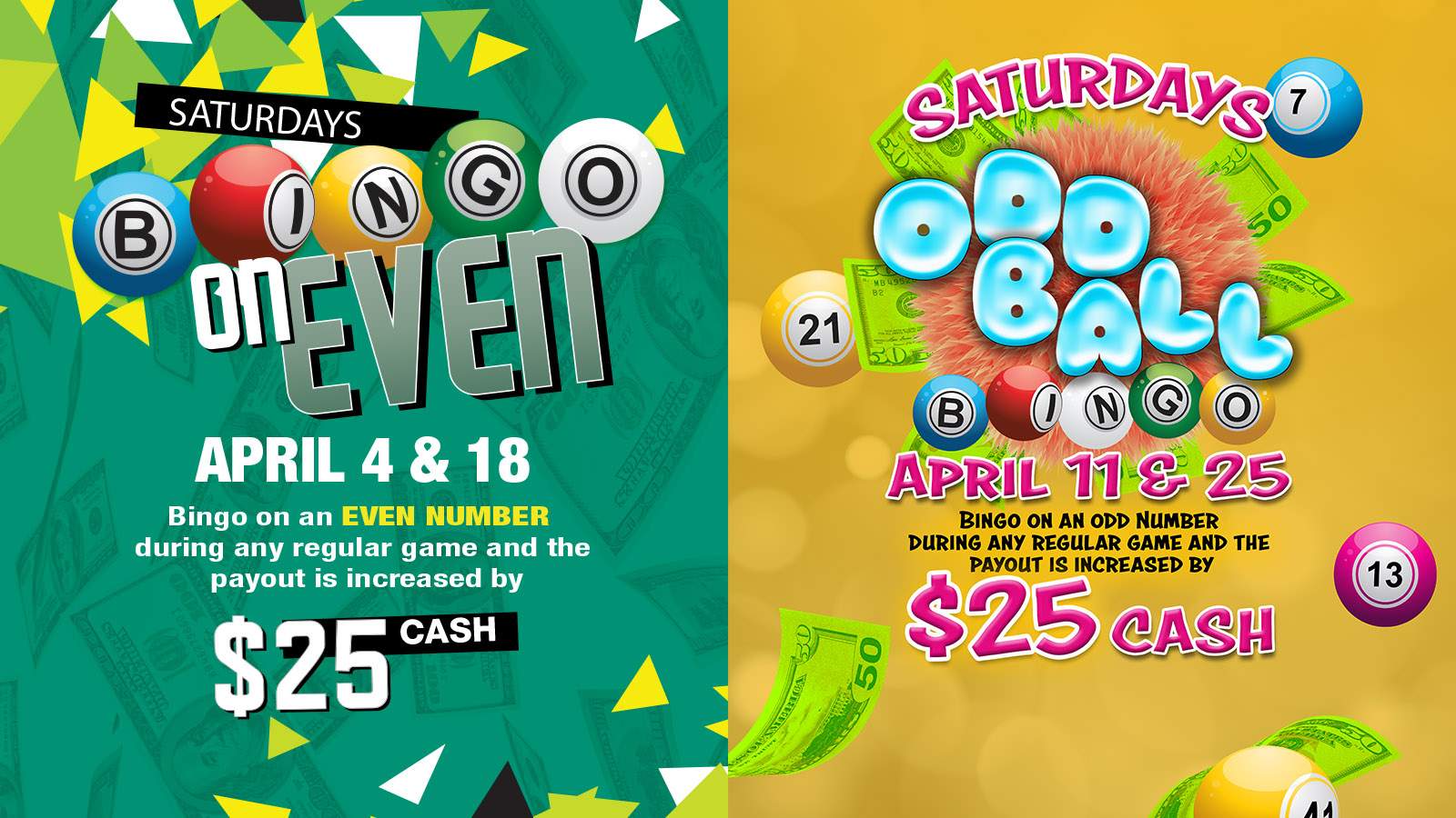 Bingo on an EVEN NUMBER during any regular game and the payout is increased by $25 CASH!