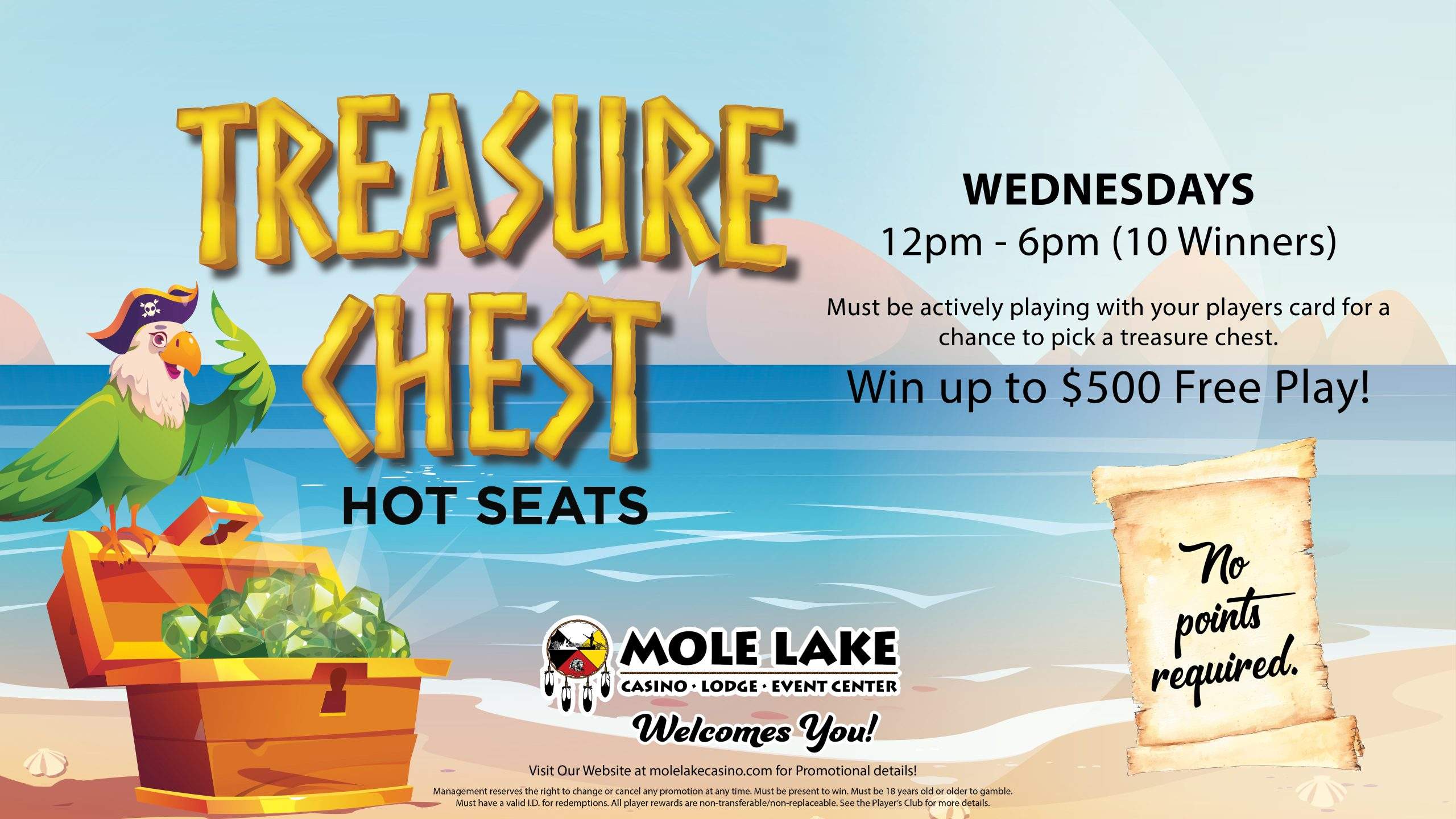 Must be actively playing with your players card for a chance to pick a treasure chest and win up to $500 free play! No Points Required!